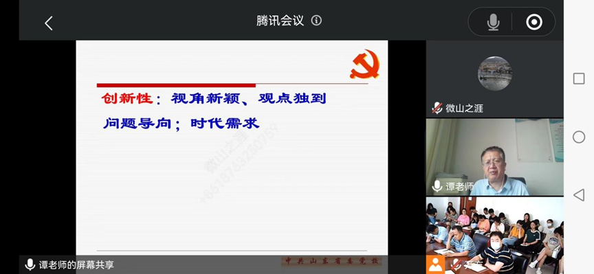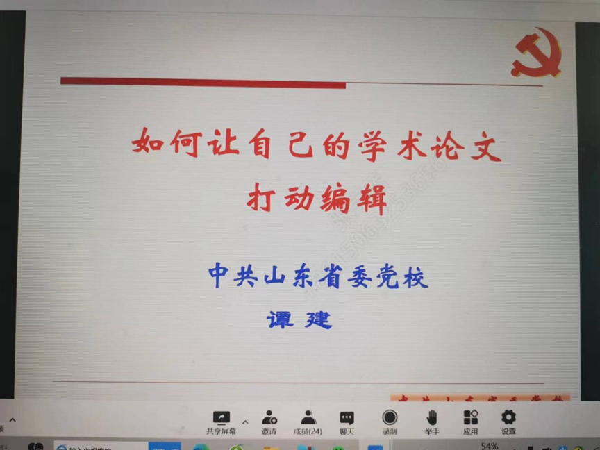 为进一步提高教师高水平学术论文写作能力,6月17日下午,由社会科学处主办、永利yl23455承办的“名师大讲堂”第十一场学术报告会,在新城校区豁然楼A315室举行。中共山东省委党校校刊编辑部主任,谭建教授应邀为全校师生作“如何让自己的学术论文打动编辑”的专题报告。报告会由永利yl23455院长陶道强教授主持,全校师生100余人通过腾讯会议参加报告会。