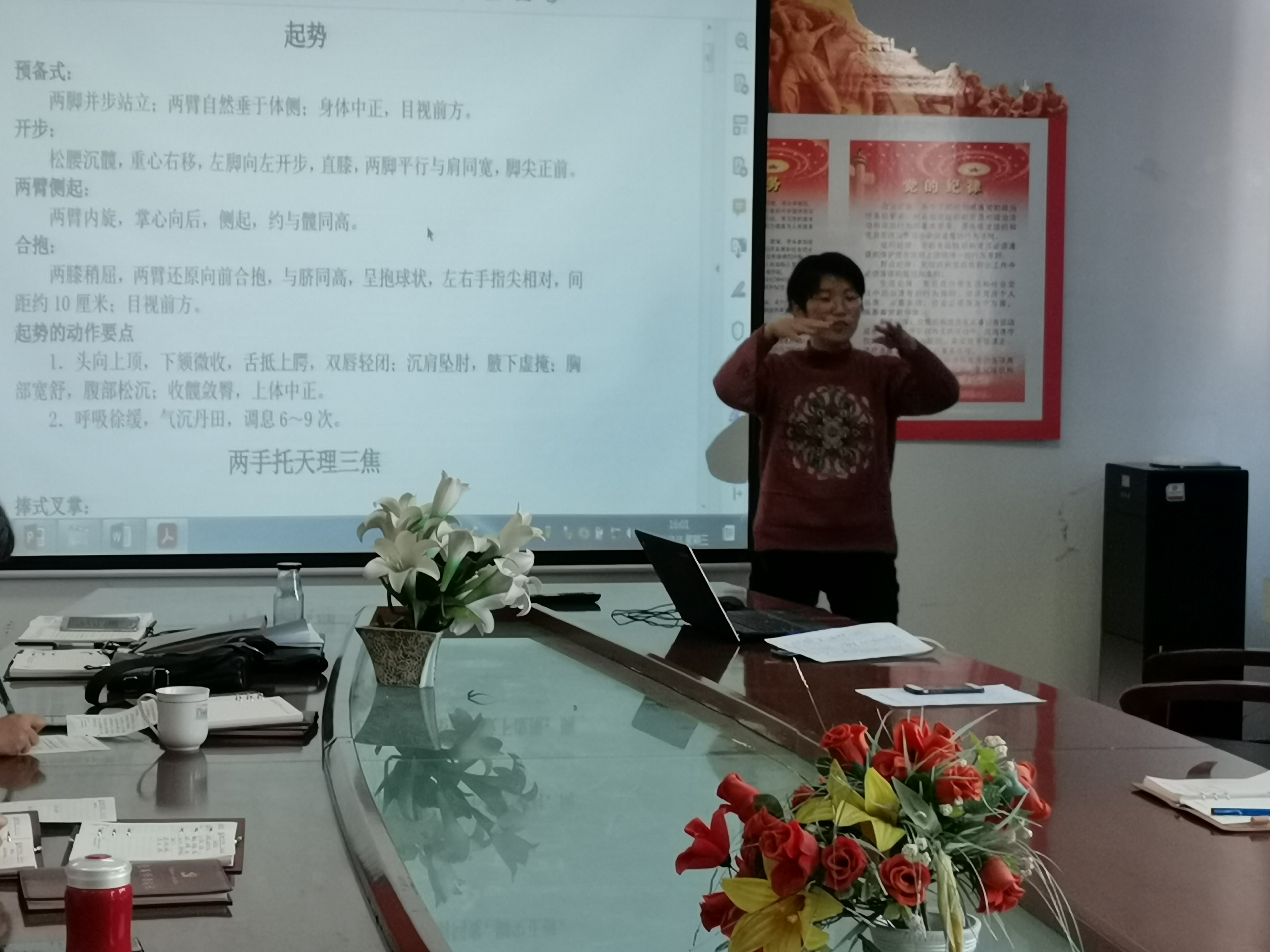 3月3日下午,朱红莉老师为全体女教工作了健身气功八段锦讲座。讲座中朱红莉介绍了八段锦的起源、练八段锦的好处,并亲自示范了动作要领。