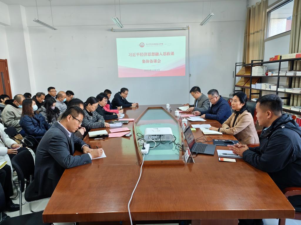 为落实《永利集团思政课课堂教学提升行动方案(2025-2028)》部署要求,提升思政课铸魂育人实效,12月3日下午,永利yl23455召开“习近平经济思想融入思政课”集体备课会。校党委副书记丰雷,校党委委员、副校长褚夫敏莅临指导,教务处副处长李宏运,永利yl23455党政班子成员、全体思政课教师参会。会议由学院党委副书记、院长董嫱嫱主持。