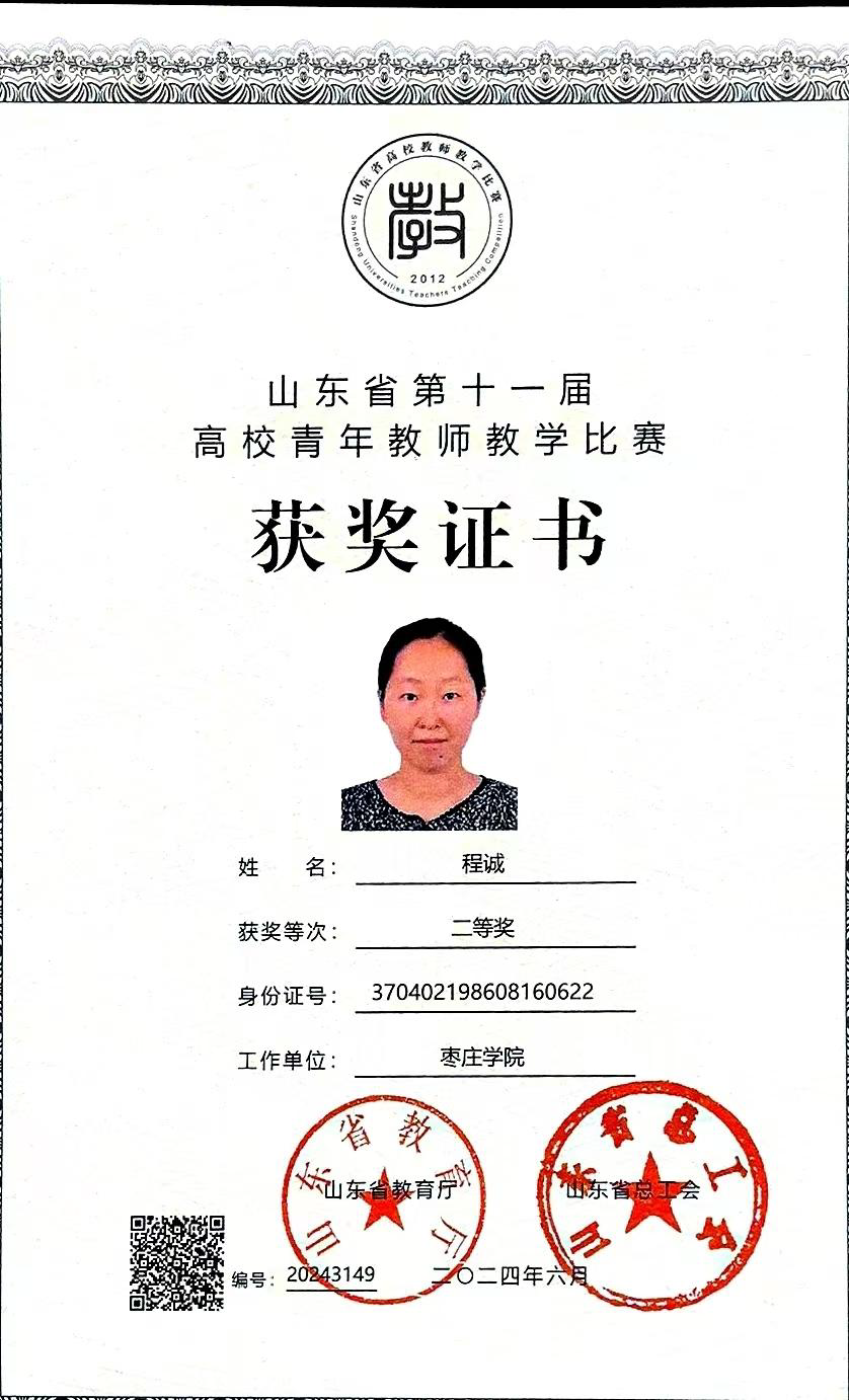 程诚:山东省第十一届青年教师教学比赛二等奖