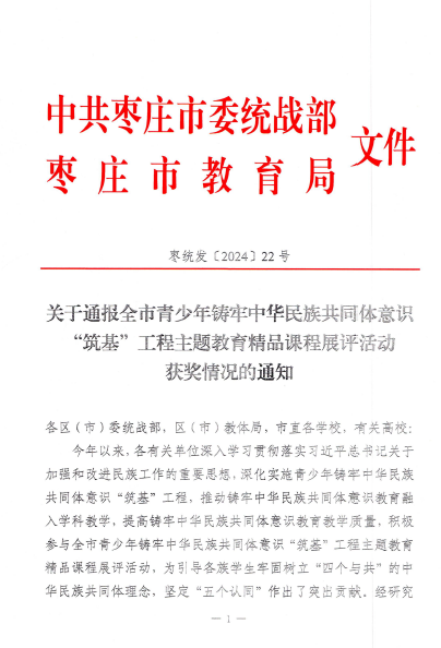 枣庄市铸牢中华民族共同体意识精品课程展评活动获奖