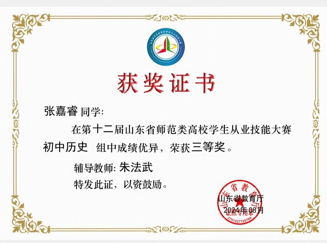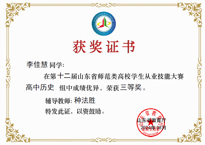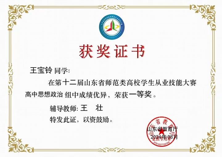王宝铃、李佳慧、张嘉睿、王佳睿:第十二届山东省师范类高校从业技能大赛获奖