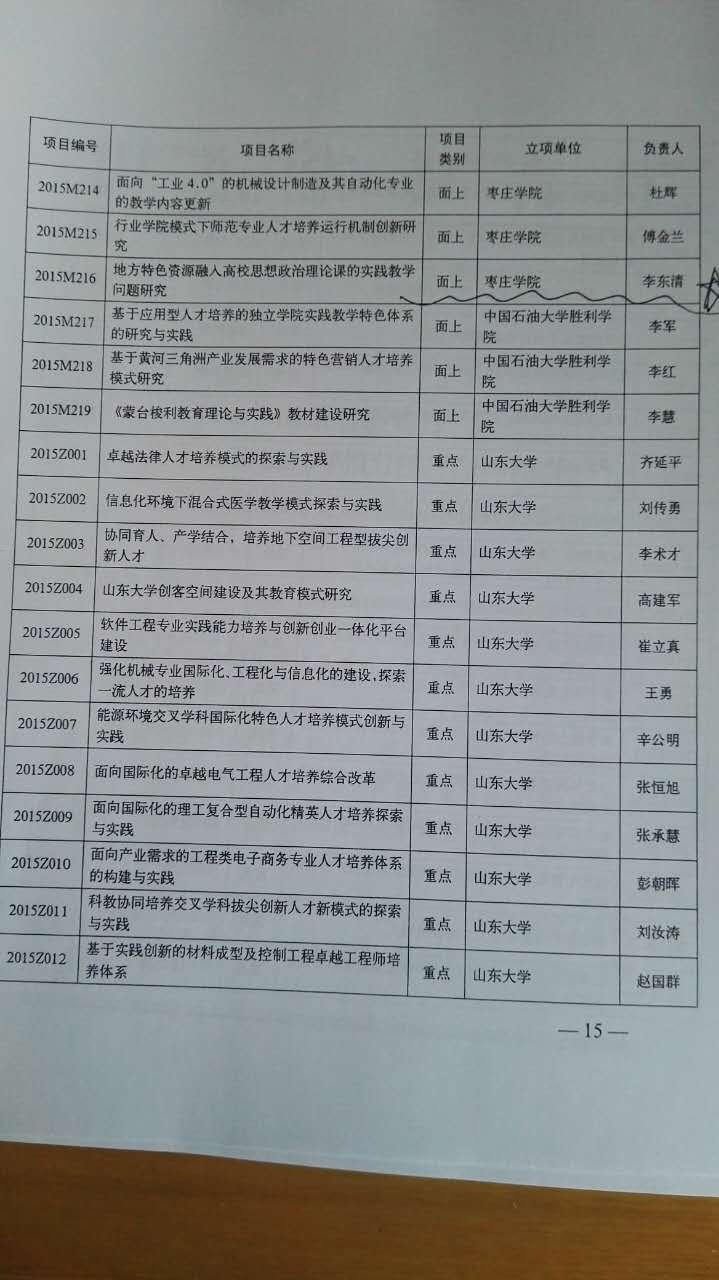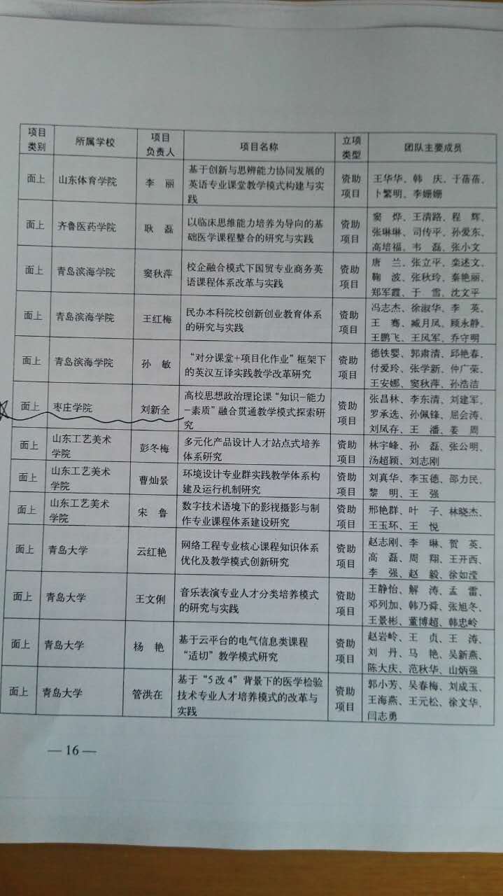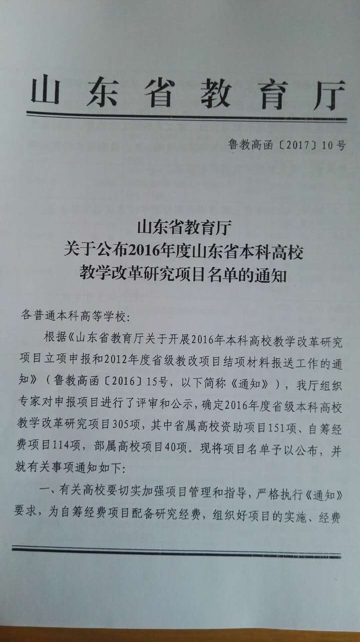 近日,山东省教育厅下发了《山东省教育厅关于公布2016年度山东省本科高校教学改革研究项目名单的通知》,确定2016年度省级本科高校教学改革研究项目305项,我校有4个项目获批立项,其中永利yl23455许士密教授的《行业学院模式下地方高校产教融合专业群建设研究》获批重点资助项目,刘新全老师的《高校思想政治理论课“知识-能力-素质”融合贯通教学模式探索研究》获批面上资助项目。