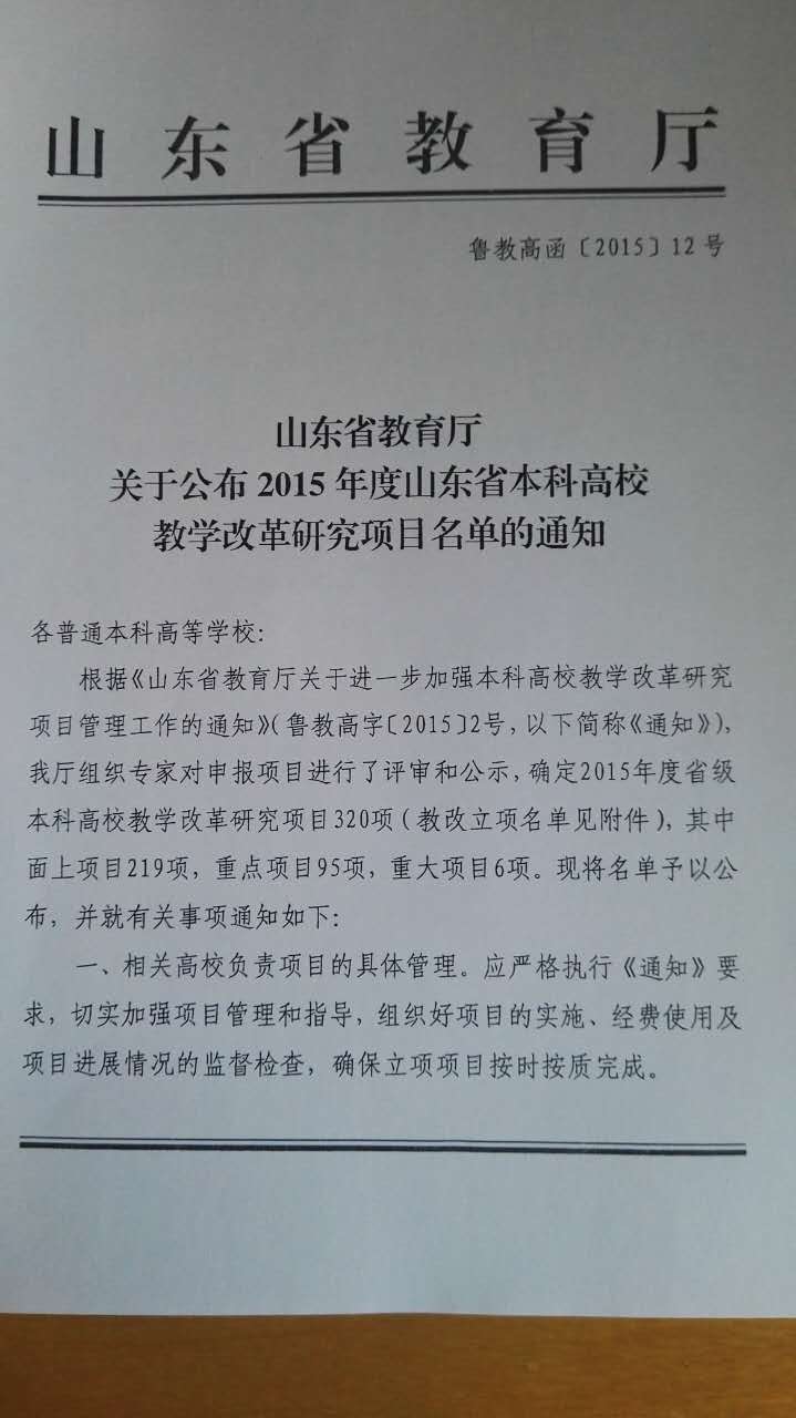 山东省教学改革研究项目针对高等教育发展和人才培养中出现的问题进行立项,是深化教育综合改革,进一步提升人才培养质量的重要举措。我院高度重视此次省级教改立项的申报工作,根据山东省教育厅立项申报的通知和学校要求积极动员,通过个人申报、学院评审等程序,推选2项课题参加学校评审和山东省本科高校教学改革研究项目的评审,最终斩获佳绩。