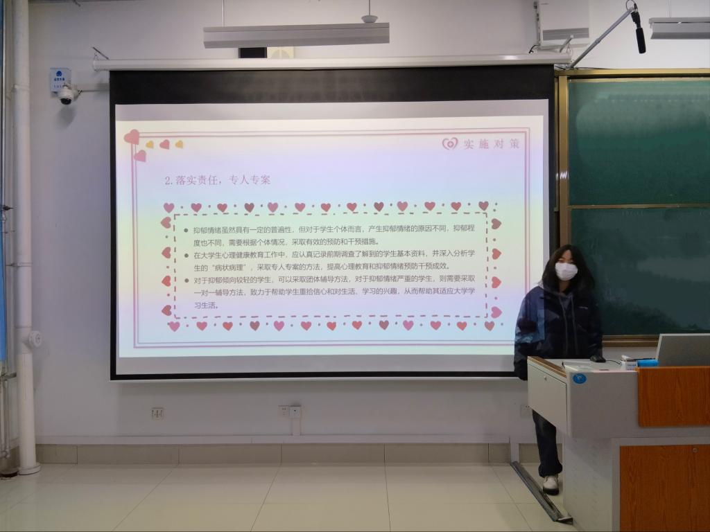 本次培训以“大学生心理教育——抑郁情绪预防”为主题,详细地解释了抑郁症的定义,并围绕心理健康工作开展情况、存在问题、实施对策等几个方面展开培训。本次培训利用PPT、讲座等方式进行心理科普宣传,有效的帮助心理委员及心理互动志愿者在日常工作中密切关注班级同学的心理健康,并及时上报出现异常心理的学生情况,切实为同学们的生活成长提供帮助。培训结束后,心理委员及心理互动志愿者纷纷表示将在今后的工作中更好发挥模范带头作用和朋辈辅导作用,积极引导班级同学配合心理工作的开展并及时为同学们提供支持与帮助。